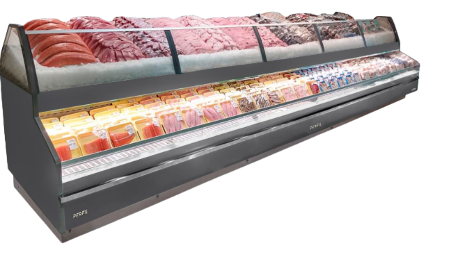 A parte inferior do expositor conta com um compartimento tipo freezer horizontal com tampas de vidro curvo deslizantes, ideal para armazenamento de peixes congelados e frutos do mar. Já a parte superior dispõe de uma vitrine refrigerada com bandejas em aço inox, inclinadas para facilitar a exposição de peixes frescos, com escoamento de líquidos e fácil higienização.