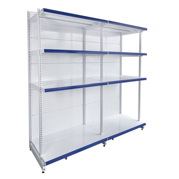 Gôndola rack embutido para supermercado. Ideal para cereais e bebidas, estrutura reforçada, modulações versáteis e alta capacidade de carga.